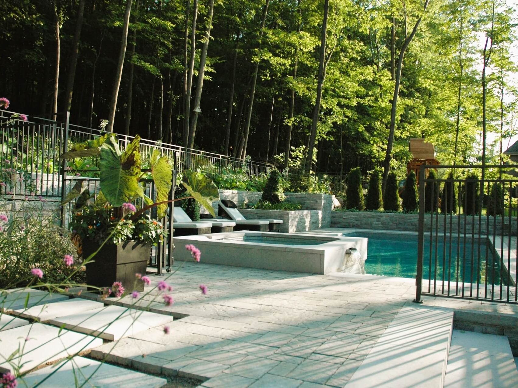 Tout près de la porte arrière, le patio en pierres St-Marc accueille avec classe une cuisine extérieure prête à recevoir les invités. Une autre section de patio, en pavé, permet de passer de la zone cuisine extérieure à la piscine creusée ou à l’entrée latérale. Il est aussi possible d’accéder à cette cour arrière surélevée par un escalier, lui aussi construit en pierres St-Marc taillées à la main.