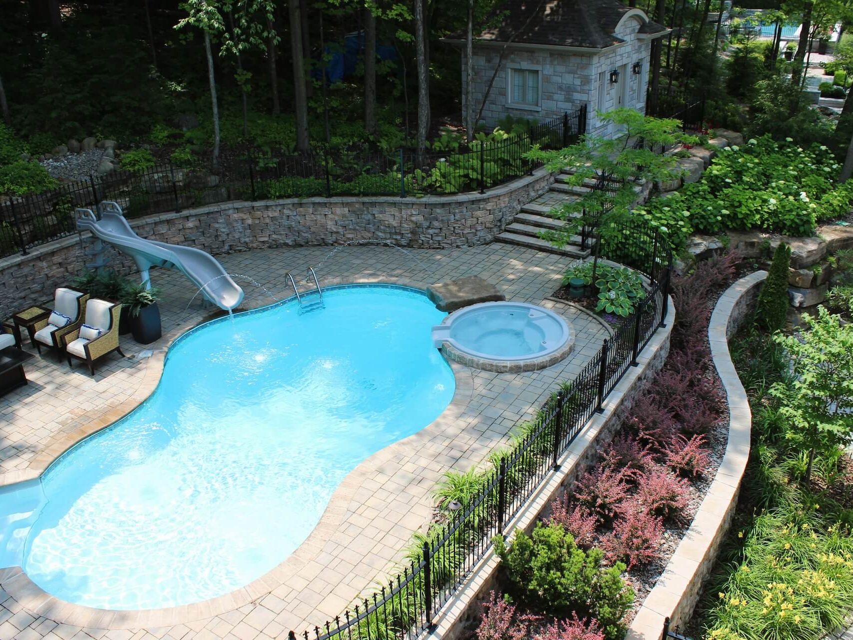 Conception de plan, éclairage paysager, terrasse et patio, plantation de végétaux, mur de roche, muret de béton préfabriqué, pierre naturelle, maçonnerie, installation de pavé uni et dalle, mobilier, espace détente, salle à manger extérieure, cuisine extérieure, piscine creusée, stationnement de pavé, pot extérieur - Zones