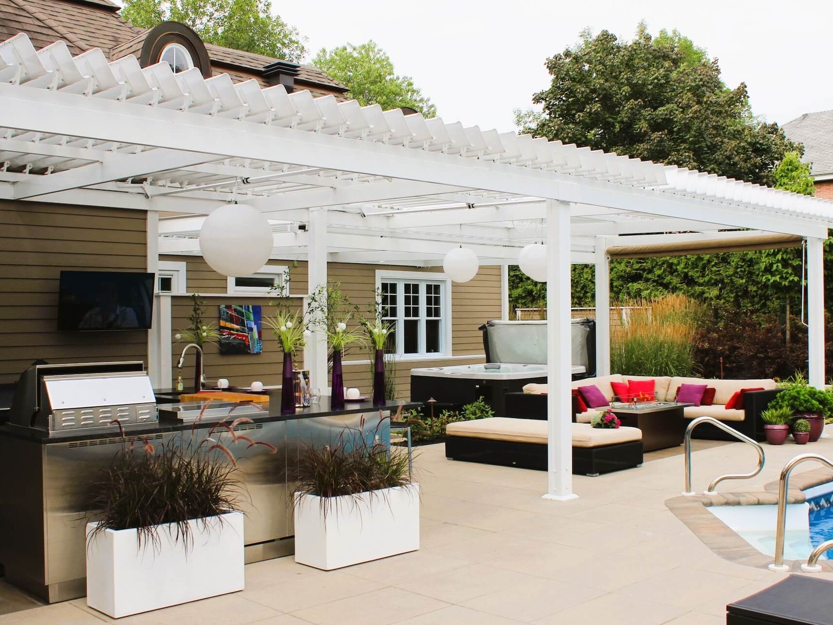 Plan d’aménagement paysager, cuisine extérieure, comptoir bar éclairage paysager, pergola Sun Louvre, création de pièces extérieures, terrasse en pavé et béton, plantation de végétaux, muret raffinato, lounge, table foyer, spa, mur d’eau - Zones