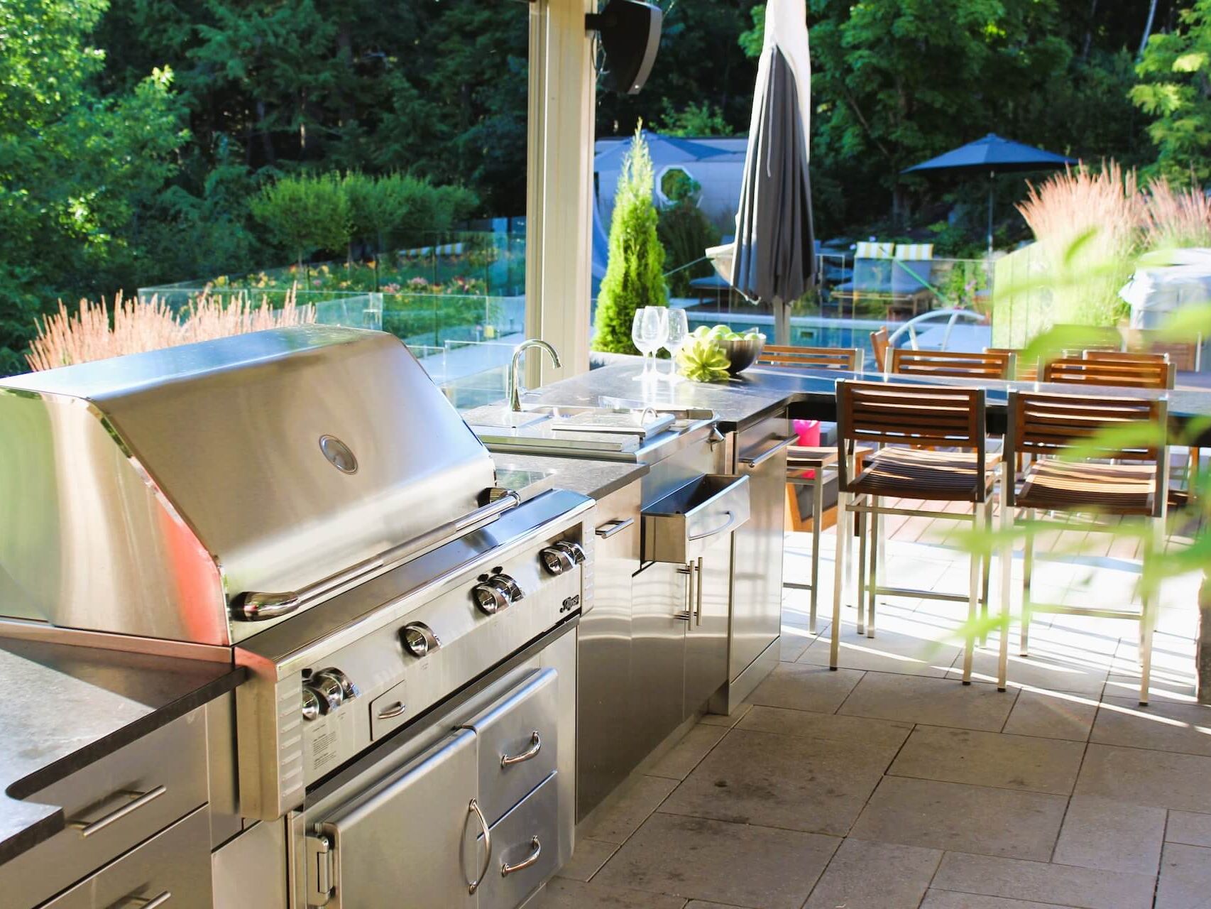 La cuisine mise en place est dotée d’une quantité impressionnante d’équipement. Installée sur une vaste pergola surmontée de lames orientables, elle est notamment pourvue d’un immense barbecue et d’un fumoir. Un comptoir bar, des espaces réfrigérés, des cabinets de rangement, un congélateur, un cellier et un lave-vaisselle extérieur complètent l’ensemble.