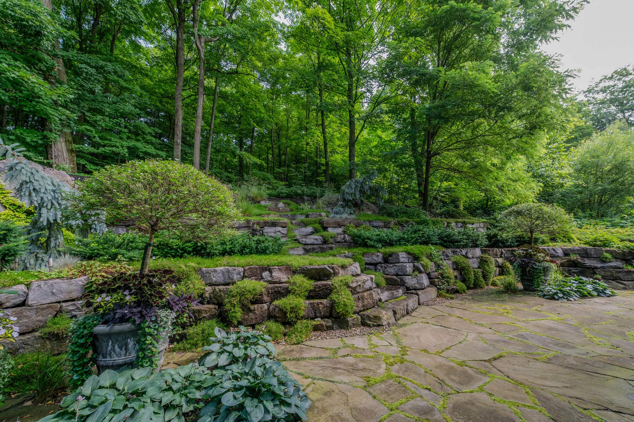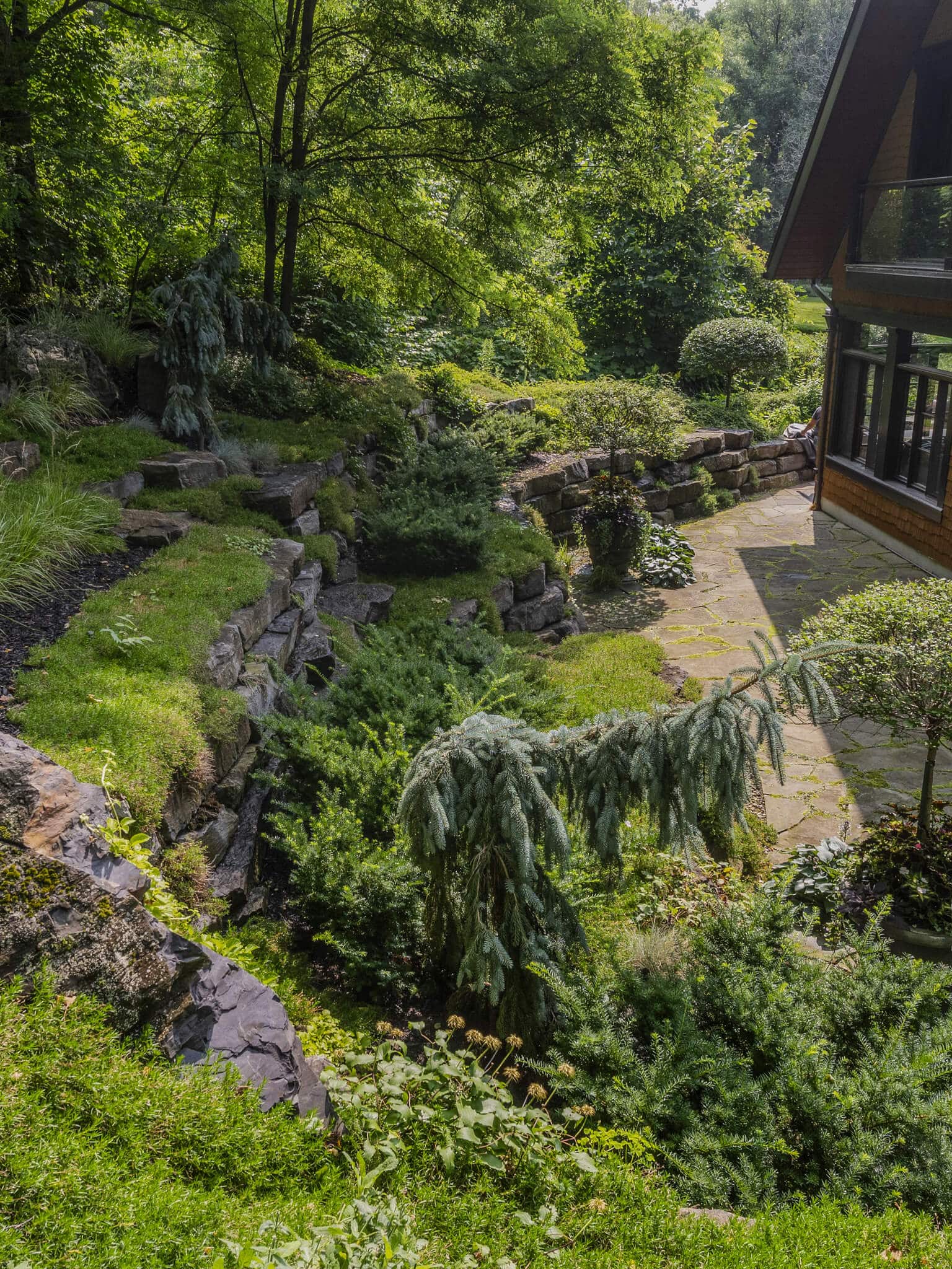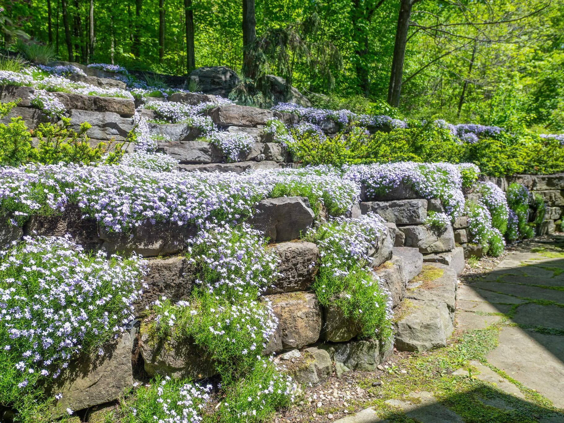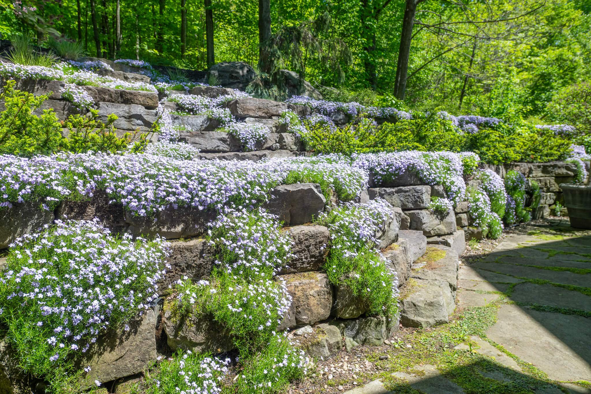 Considérant le fort dénivelé du site et la proximité de la maison, notre objectif a été de végétaliser l’imposante construction de pierre Champlain, dont la structure rappelle celle d’un amphithéâtre. Cet espace est visible de la cuisine de la résidence, il est une vitrine sur l’Extérieur. Les végétaux texturés à feuillage et floraison bleue sont installés de manière stratégique afin d’habiller les pierres et de créer différents points focaux, selon la saison. Par exemple, le phlox bleu donne l’impression d’une cascade d’eau naturelle qui coule entre les pierres. Tandis qu’à la période estivale ce sont les mouvements des graminées qui attirent l’œil. À ce moment le phlox prend un aspect de mousse avec son feuillage vert duveteux. L’Escalier au centre mène aux sentiers pédestres dans la forêt en surplomb. Une invitation à explorer la nature environnante!