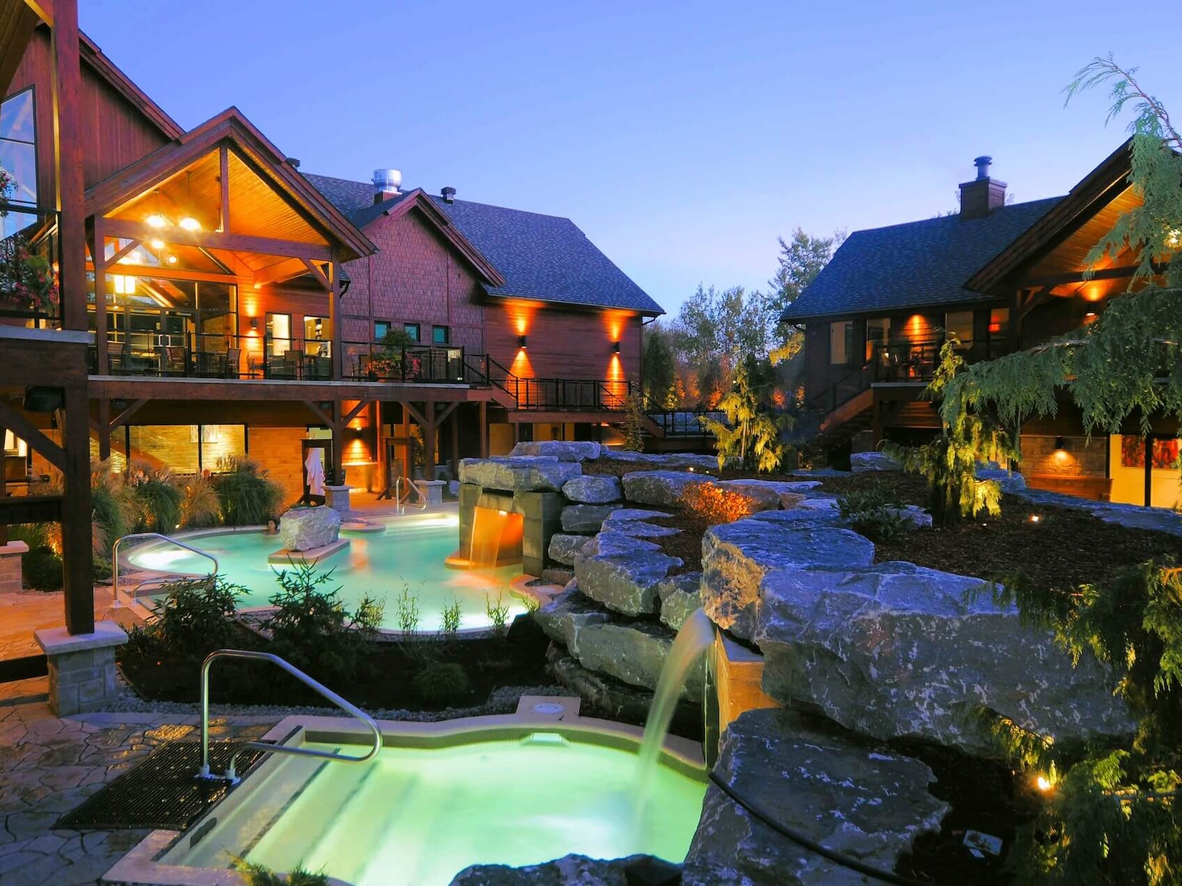 Dans le cadre de ce mandat, un plan général avait été fourni par notre client. Le design de ce plan, d’abord très linéaire, a été revu et modifié par notre architecte paysagiste afin de rendre l’ensemble de l’aménagement plus naturel. Un travail de mise en valeur des formes atypiques des piscines et des spas a été réalisé permettant d’ancrer ce milieu à son environnement pour offrir un lieu de détente et de ressourcement exceptionnel. Ces changements contribuaient également à optimiser l’équipement commercial utilisé pour le fonctionnement des spas, ce qui faisait partie de l’objectif initial visé. Il va sans dire que des dimensions très précises devaient être établies et respectées, et ce, pour tous les aspects qui caractérisent ce site dédié à la détente, au calme et à la contemplation.