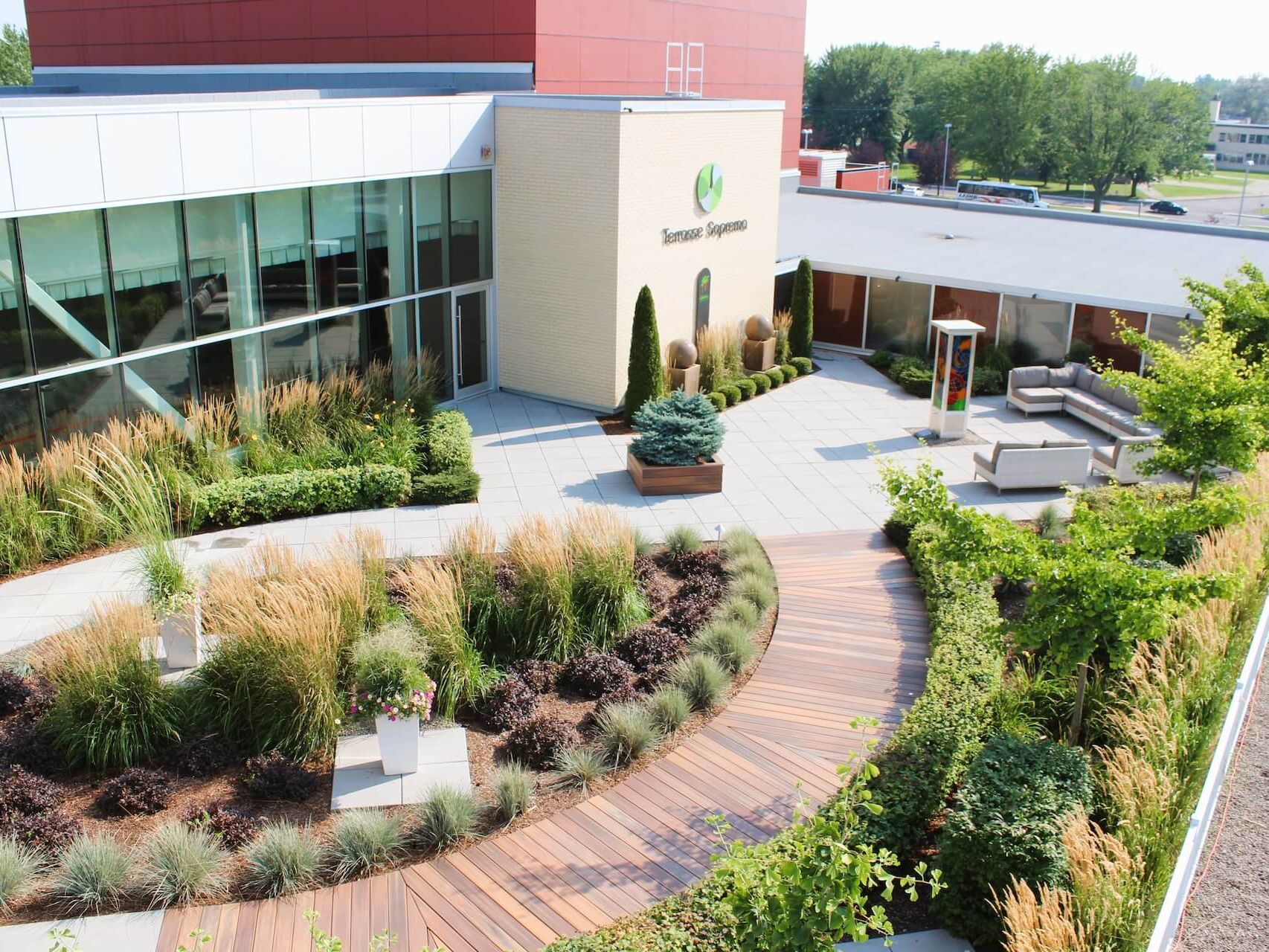 Pour s’harmoniser au style épuré de l’édifice, l’architecte paysagiste Lynda Beausoleil a ni plus ni moins transformé ce simple toit rectangulaire en un espace alliant lignes courbes et différents revêtements de sol. Le trottoir en composite, une solution de remplacement au bois (sans entretien), marié avec les dalles de béton procurent une impression de dynamisme.